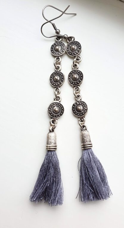 Søte og enkle øredobber i sølv med liten dusk. Ca. 10 cm lange.