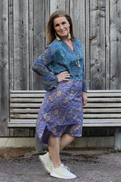 For å lage denne kjolen har man brukt flere vintage sarier fra India.