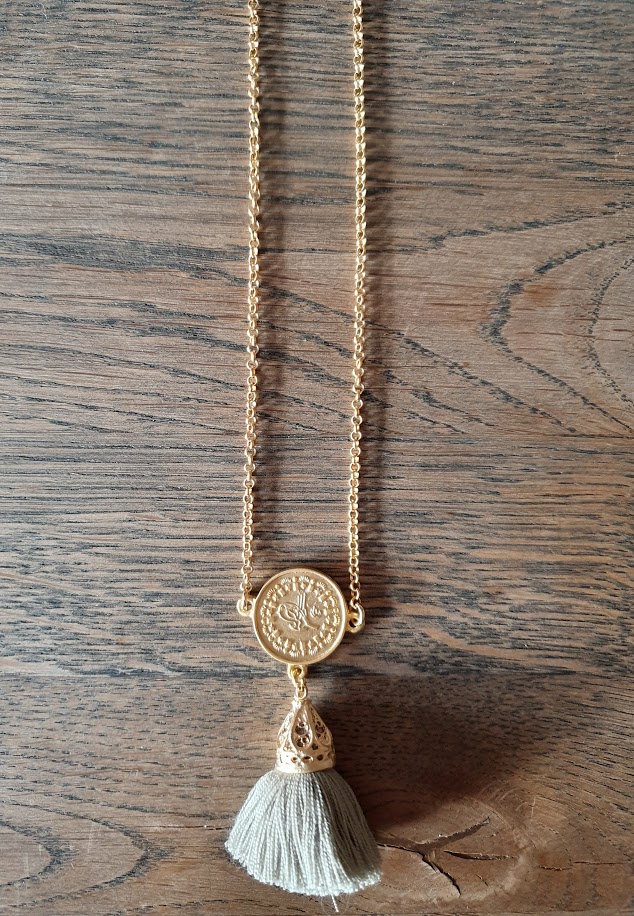 Enkelt kjede i i bohemstil, med en dusk i beige, og medaljong.