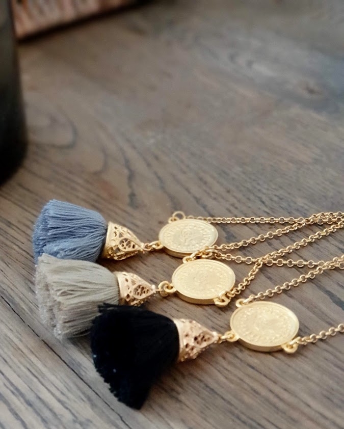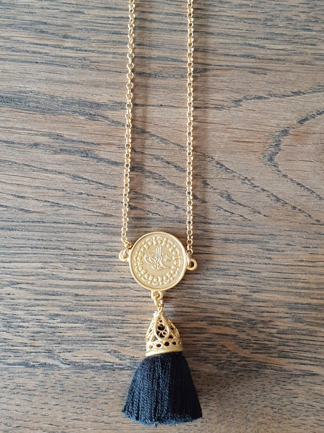 Enkelt kjede i i bohemstil, med en dusk i svart, og medaljong.