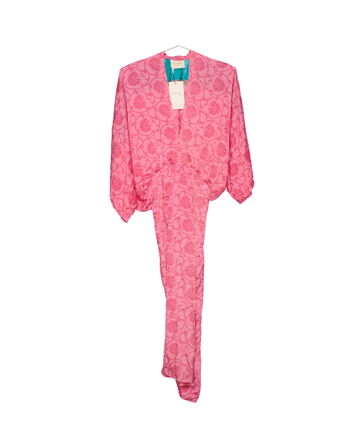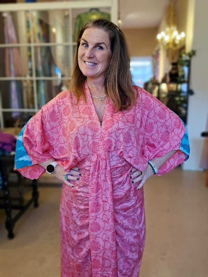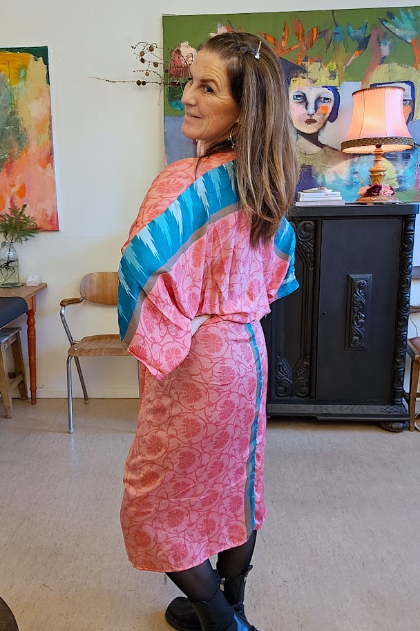 For å lage denne kjolen har man brukt vintage sarier fra India, brukt av kvinner, som et saree pakket rundt kroppen deres.