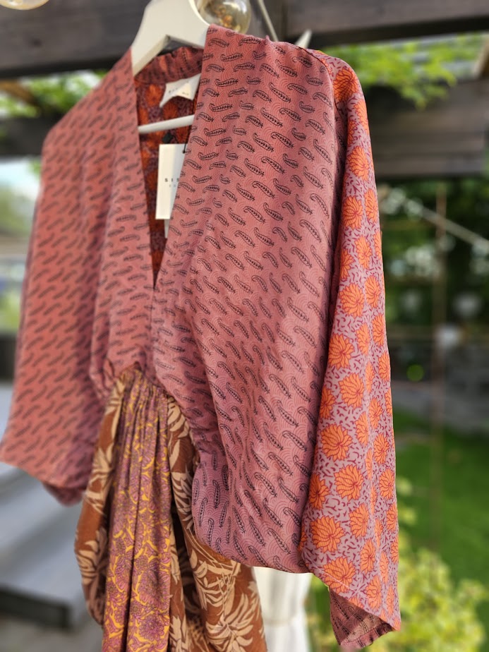 For å lage denne kjolen har man brukt vintage sarier fra India, brukt av kvinner, som et saree pakket rundt kroppen deres. Alle plagg fra Sissel Edelbo har altså vært brukt før de ble re-designet.
