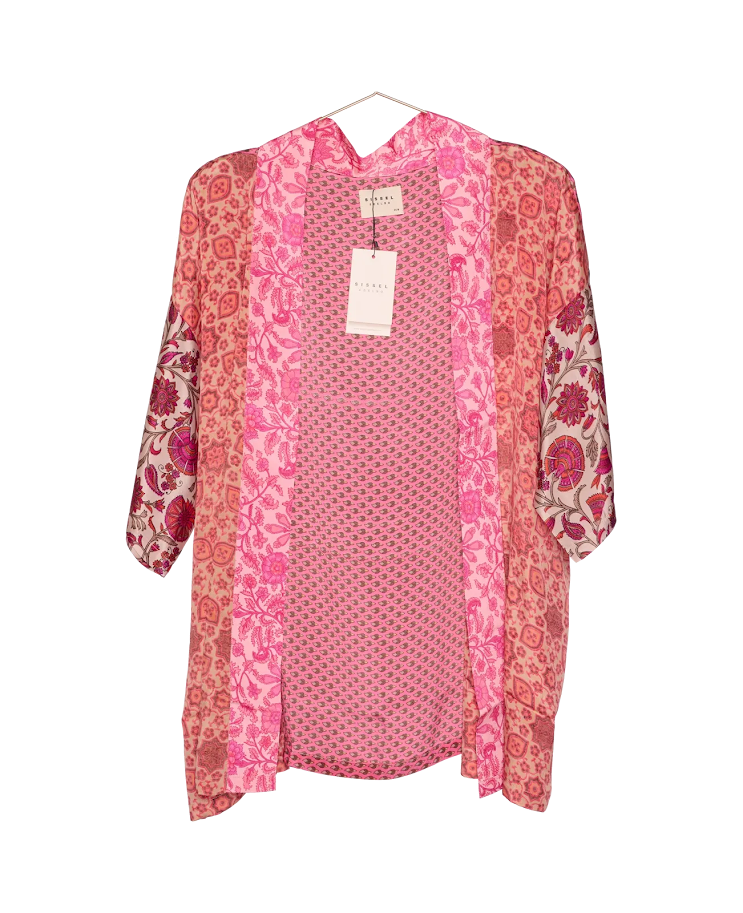 For å lage denne vakre kimonoen har man brukt vintage sarier i silke fra India.