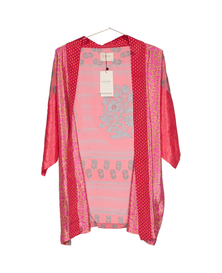 For å lage denne vakre kimonoen har man brukt vintage sarier i silke fra India.