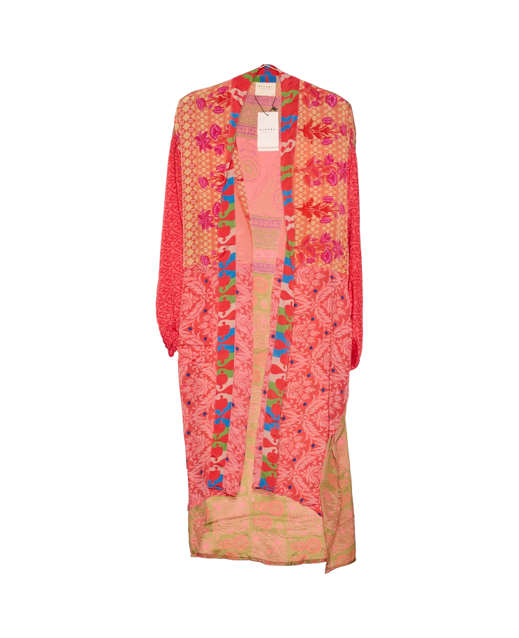 For å lage denne kimonoen har man brukt vintage sarier fra India.