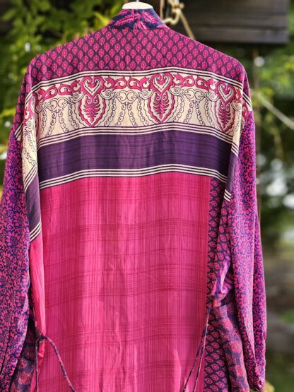 For å lage denne kimonoen har man brukt vintage sarier fra India.